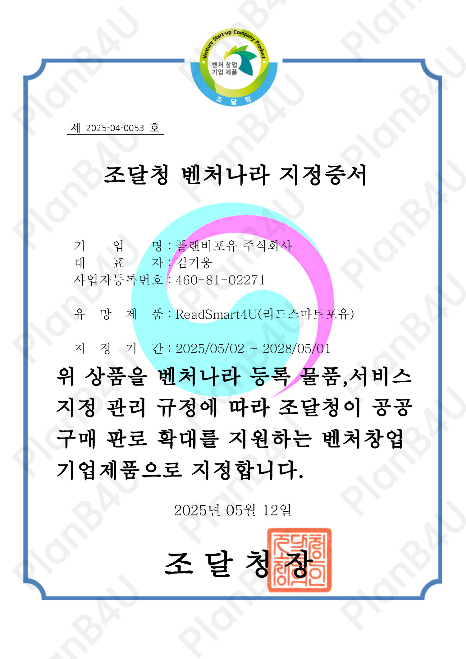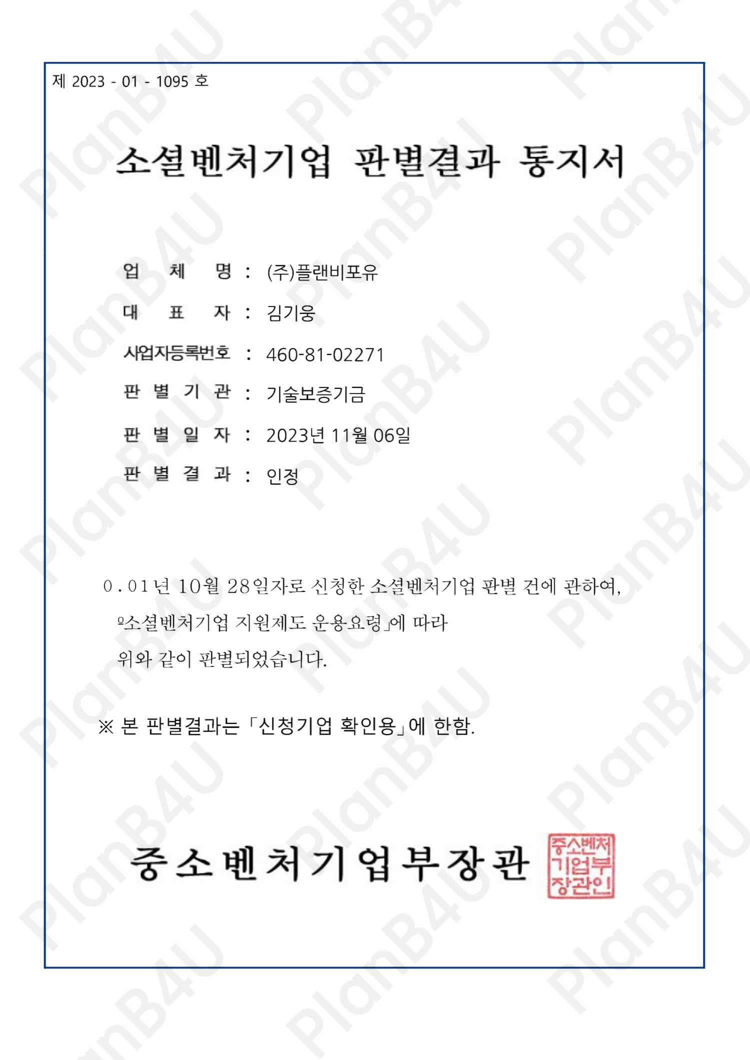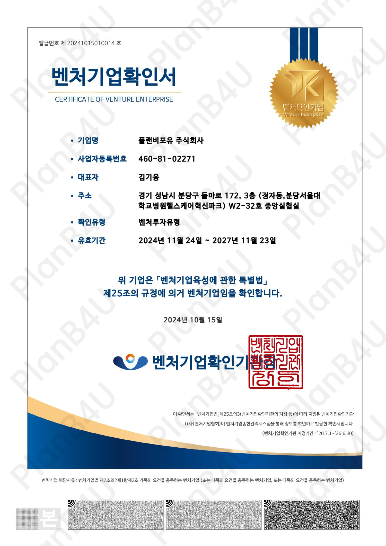 PLANB4U가 획득한 공식 인증 현황입니다.
